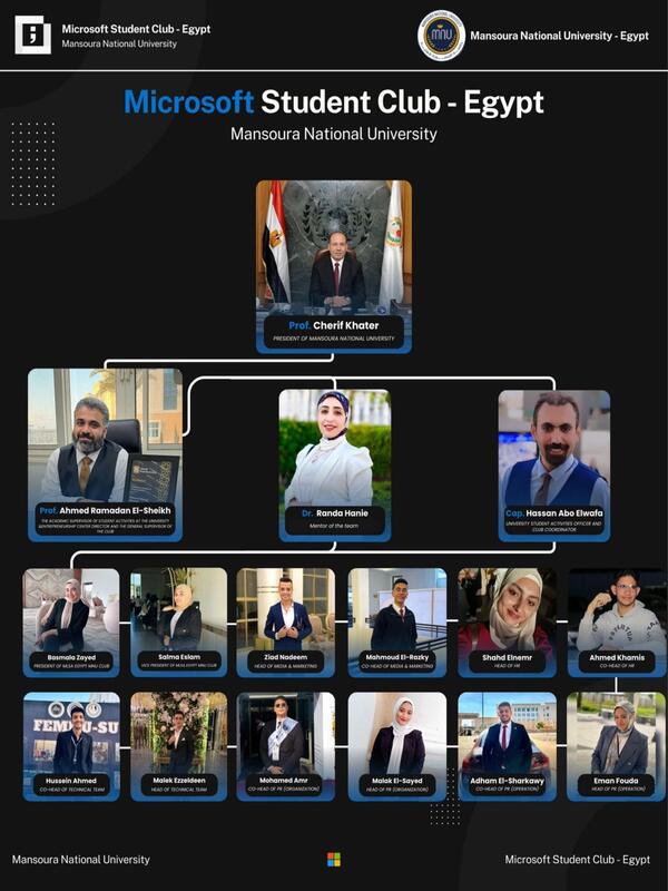 Faculty of Pharmacy Announces the Launch of Microsoft Learn Student Ambassadors Egypt MNU Club Supporting Students’ Acquisition of Technical Skills. In line with Mansoura National University’s vision to support digital transformation, innovation, and student capacity building and under the patronage of Prof. Dr. Sherif Khater, President of Mansoura National University, the university announced the official launch of Microsoft Learn Student Ambassadors Egypt MNU Club (MLSA Egypt MNU Club) at Mansoura National University. The club operates under the leadership of Prof. Dr. Ahmed Elsheikh, Director of the Entrepreneurship Center and Supervisor of MLSA Egypt MNU Club, reflecting the University’s commitment to empowering students with future-ready technical and leadership skills that align with global technological advancements and labor market needs. The club is supervised and coordinated by Dr. Randa Hany, Team Coordinator, with the support and supervision of Mr Hassan Abou Elwafa, Student Activities Officer, ensuring effective integration of student activities within the University’s educational and extracurricular framework. MLSA Egypt MNU Club aims to create a dynamic and innovative student community by providing hands-on learning opportunities through technical training programs, educational workshops, seminars, and community initiatives. The club focuses on developing students’ skills in modern technologies, leadership, teamwork, and professional development through collaboration with Microsoft Learn and global MLSA resources. The club is part of the MLSA Egypt Clubs Initiative, a national initiative that seeks to unify Microsoft student clubs across Egyptian universities, promote knowledge sharing, and support the development of a new generation of digital leaders capable of contributing to Egypt’s technological and entrepreneurial ecosystem. In this context, the University announces the formation of the club’s official leadership board for the academic year 2026, marking the beginning of a new phase of student engagement in technology-driven learning and innovation. The club also opens its official call for students wishing to join and participate in its activities through the following link: CLICK HERE |